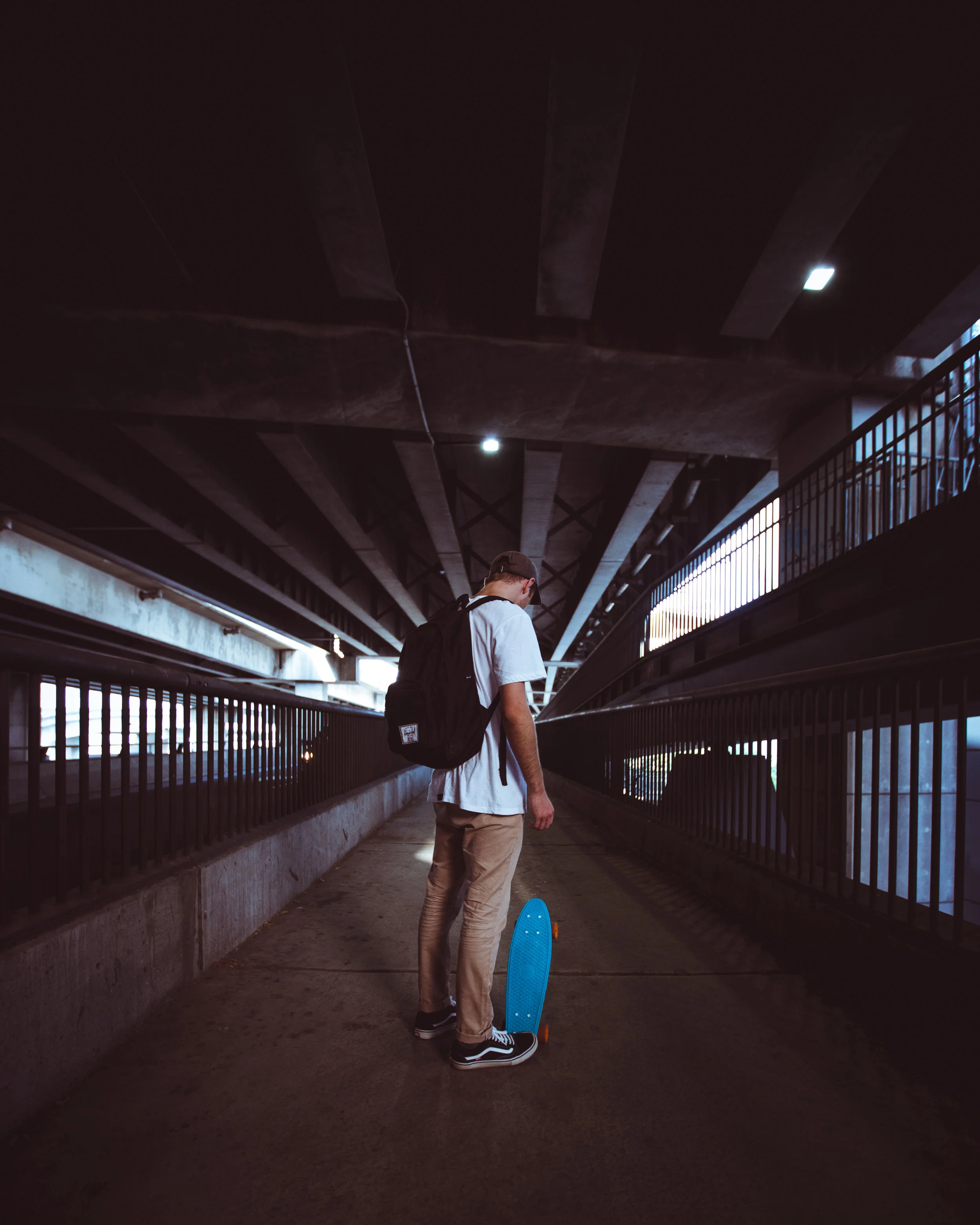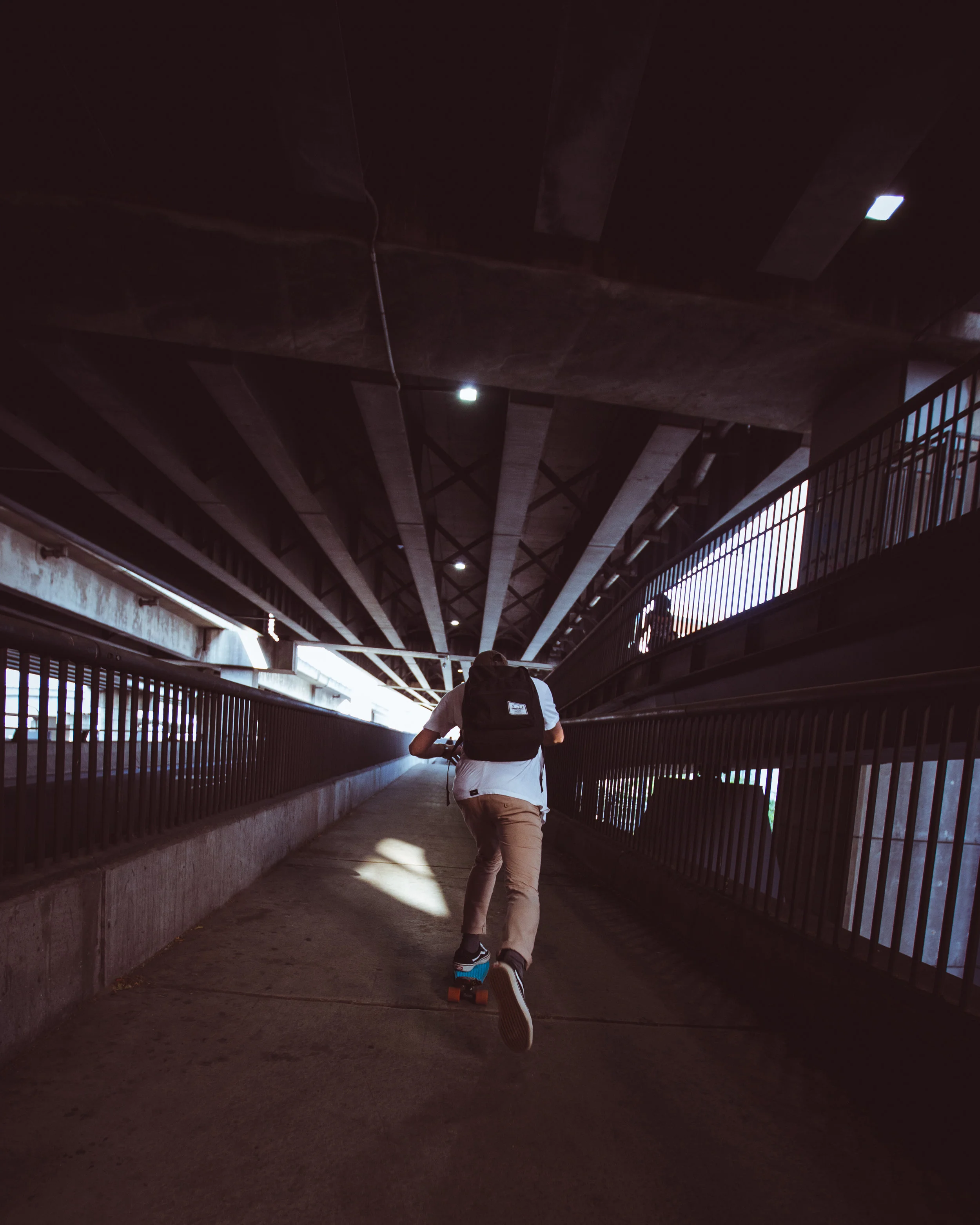 We started off at this rad overpass. I had seen this spot in a few of @borneon.lad's photos before and liked how the lines worked in photos. The light was just right (5:30PM); dark enough to give it that moody urban feel, but just enough to light Rhys & the Penny board up.