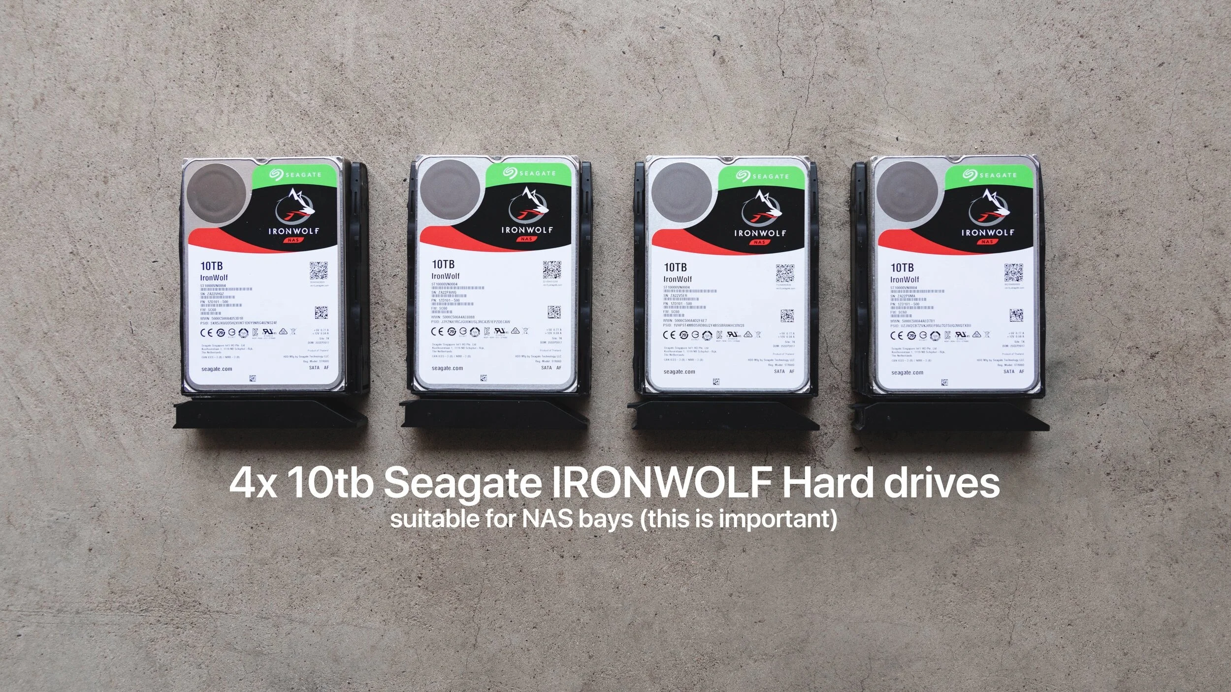 I went with these awesome 10TB drives from Seagate: IronWolf 10TB 3.5" hard drives. I've used Seagate drives for years and they haven't failed me yet. Seagate's IronWolf range are NAS-optimised, are compatible in a multi-bay setup (this is important) and are fast enough for my needs.