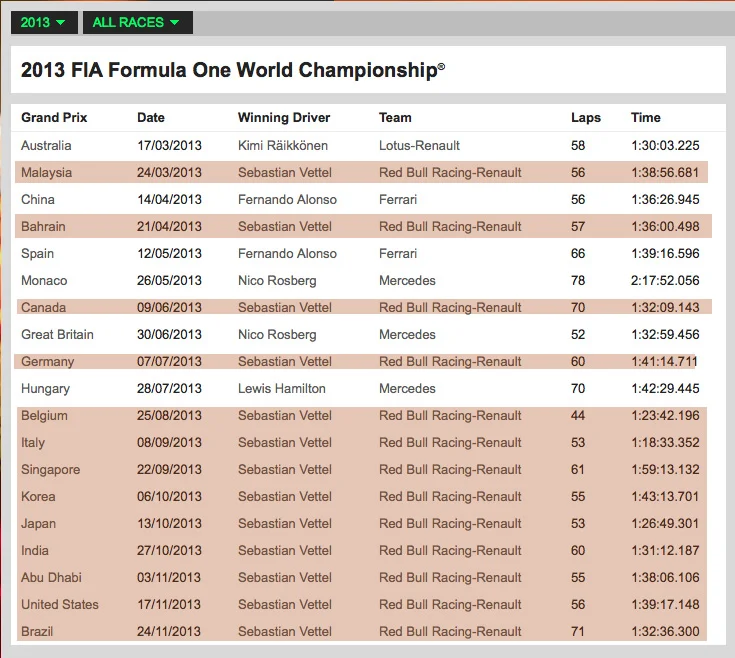Last season I couldn't help but notice how lopsided the results were (see picture to the right). Of the 19 race meets for the season of 2013, 13 were won by Sebastian Vettel of Red Bull Racing-Renault. In fact, he consecutively won the last 9 races.
